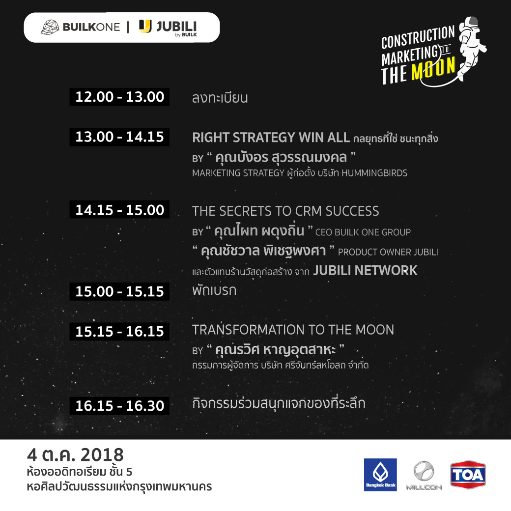 ในงาน Construction Marketing to THE MOON คุณจะได้แนวคิดใหม่ๆ ที่จะช่วยจุดประกายให้คุณนำเอาไปพัฒนาและปรับใช้กับธุรกิจวัสดุก่อสร้าง และในงานนี้คุณจะได้พบกับ