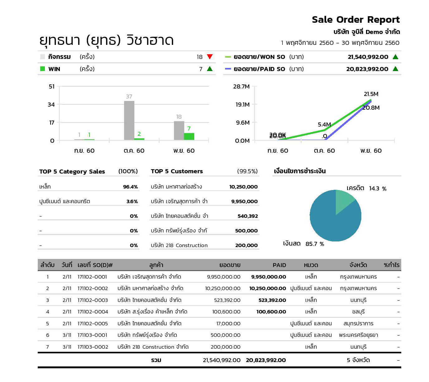 สรุปการขายของพนักงานขายโดยแยกแต่ละคน ว่าขายไปกี่ออเดอร์ ได้ยอดเท่าไหร่ กำไรเท่าไหร่ สามารถเลือกช่วงระยะเวลาที่เราต้องการได้ รายงานตัวนี้แหละที่จะช่วยชีวิตทีมงานขายแต่ละคน ไม่ตั้งมานั่งปั่นในเย็นวันอาทิตย์เพื่อไปนำเสนอในเช้าวันจันทร์
