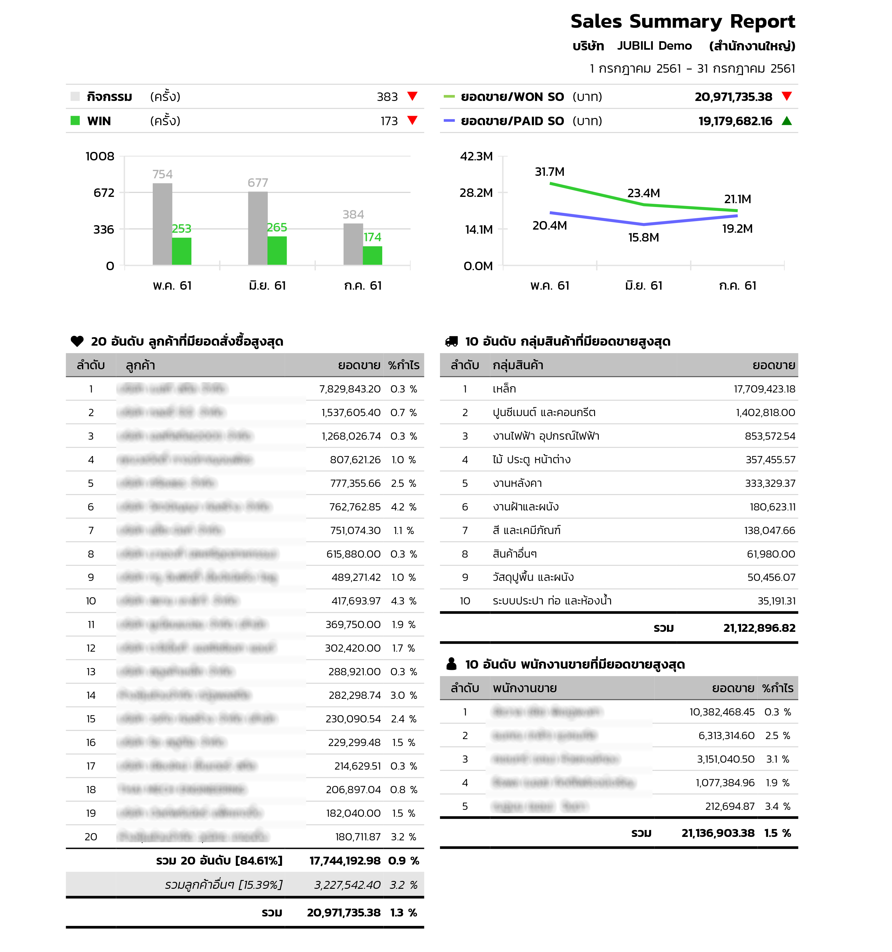 JUBILI by BUILK มีรายงานที่ออกแบบมาเพื่อทีมขายโดยเฉพาะ โดยปัจจุบันจะมีรายงานทั้งหมด 4 ตัว ซึ่งก็ครอบคลุมที่จะตอบคำถามประเด็นต่างๆ ในการประชุมทีมขายแต่ละครั้งได้ ได้แก่