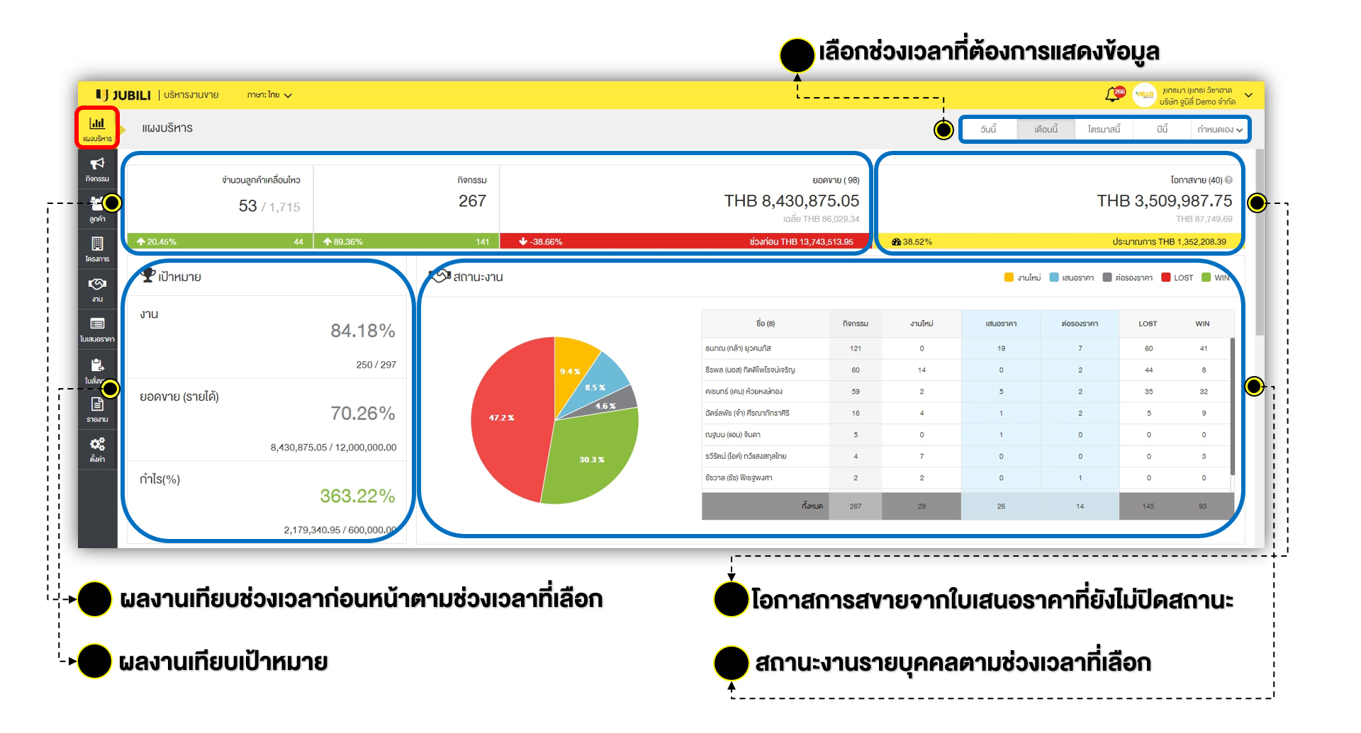ตัวช่วยสำคัญที่จะลดระยะเวลาการประชุมของคุณให้สั้นลง โดยผู้บริหารสามารถเข้ามาดูภาพรวมการขายของทั้งบริษัท ดูการทำงานของพนักงานแต่ละคนได้ โดยผู้บริหารสามารถตั้งเป้ายอดขายในแต่ละเดือนไว้ และสามารถเช็คได้ว่าตอนนี้ห่างจากเป้าอยู่เท่าไหร่ เพื่อจะได้ปรับแผนธุรกิจได้ถูก ไม่ต้องมารอสิ้นอาทิตย์ทีมานั่งปั่นรีพอร์ทที
