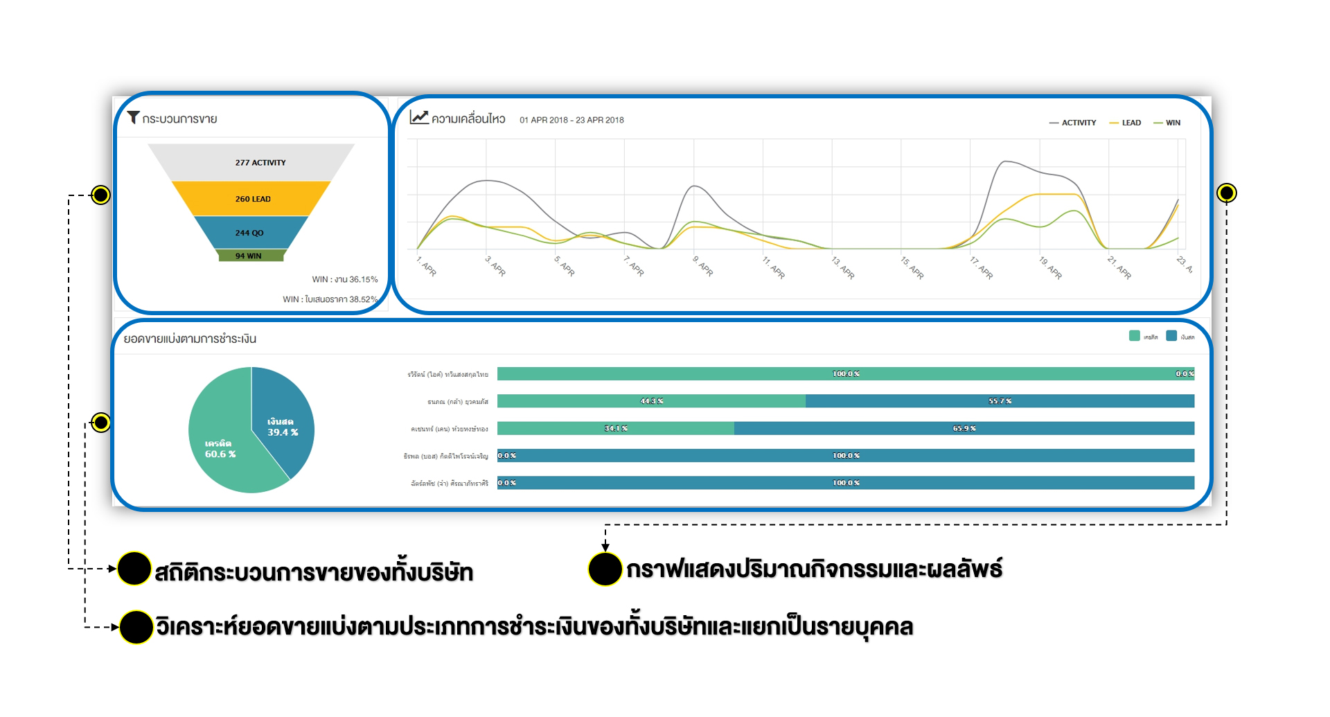 นอกจากนี้ยังสามารถวิเคราะห์ผลลัพธ์การทำงานเมื่อเทียบกับกิจกรรมที่ทีมขายทำ อย่างเช่น เดือนนี้ทีมขายมีทีมขายทำกิจกรรมมากจะส่งผลให้ยอดขายเพิ่มขึ้นตามหรือไม่ โดยไม่ต้องเอาไฟล์ Excel มา Pivot ให้เสียเวลา