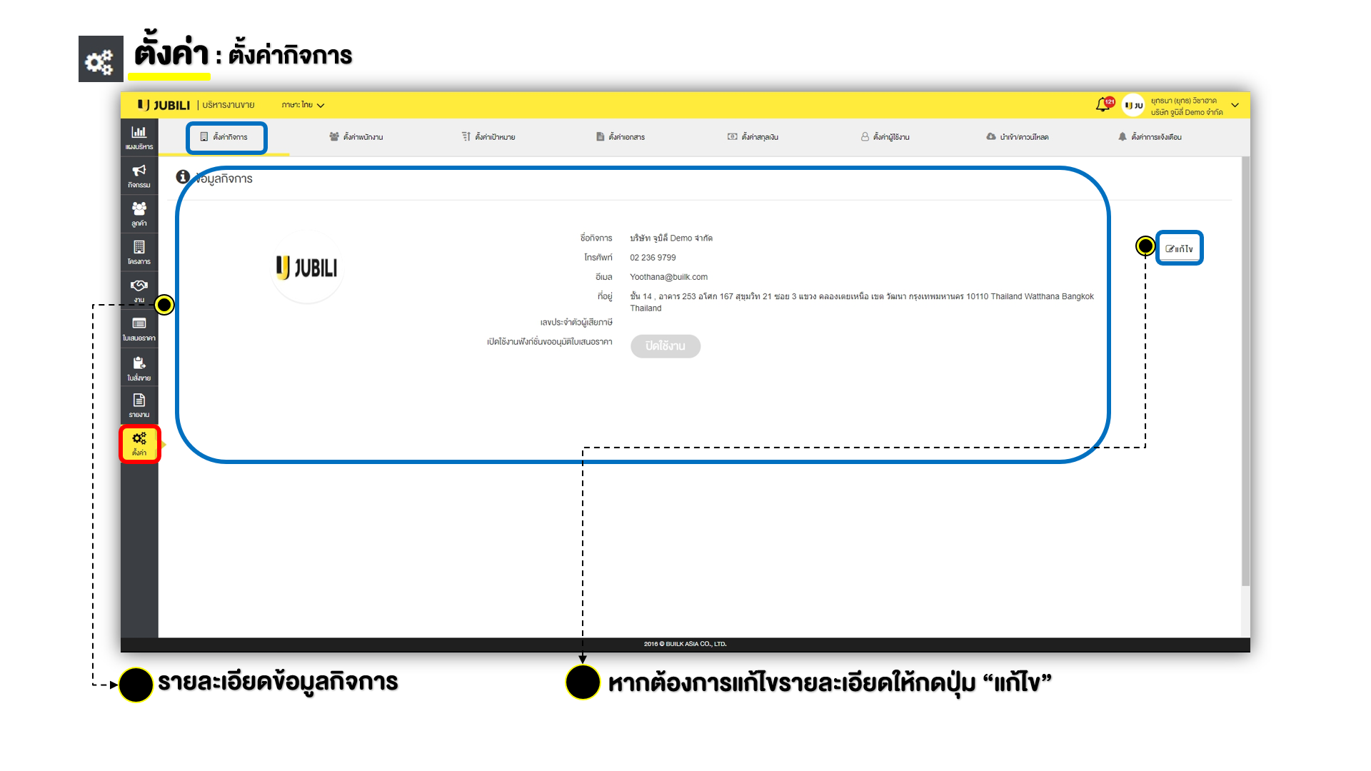 ตั้งค่ารายละเอียดข้อมูลของกิจการ ชื่อ ที่อยู่ โลโก้ของบริษัท
