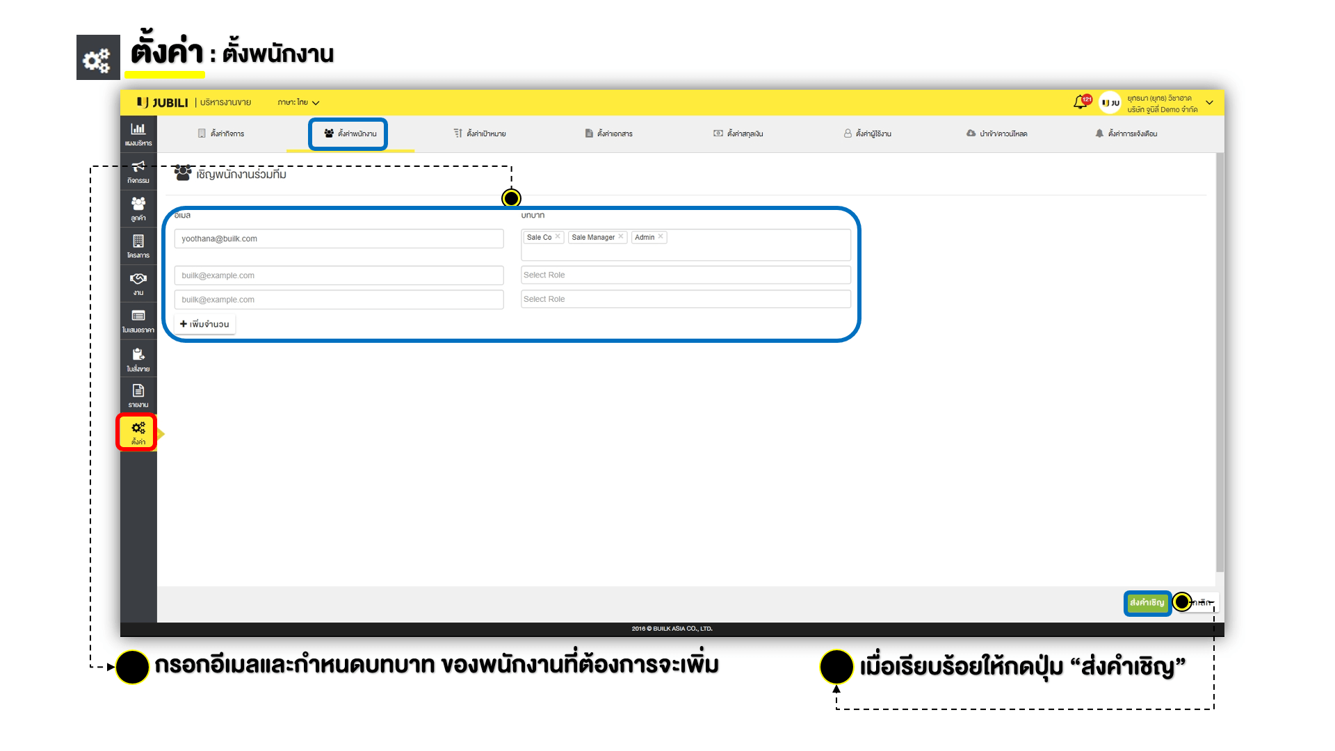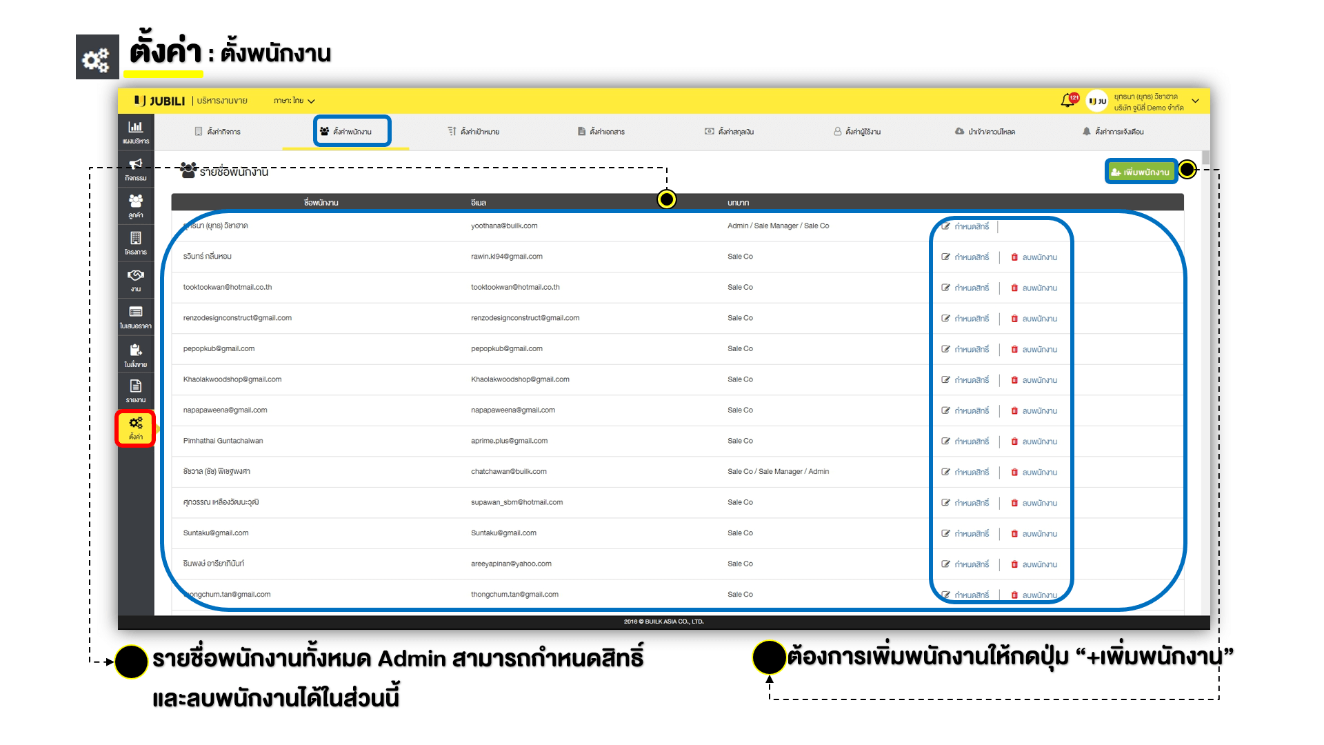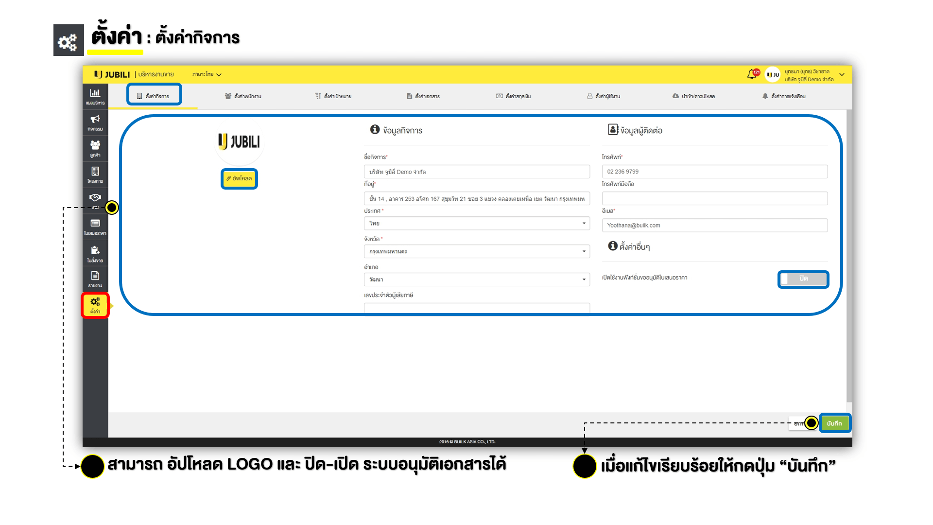 JUBILI by BUILK สามารถทำการตั้งค่าโปรแกรม เพื่อให้เหมาะสมกับความต้องการของบริษัท โดย Admin สามารถทำการตั้งค่าได้ด้วยตนเองได้ ด้วยแถบตั้งค่าทางด้านซ้ายมือ