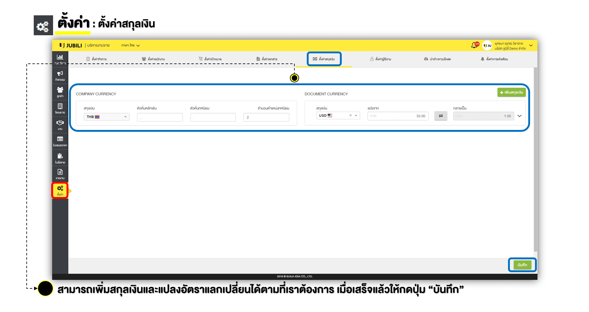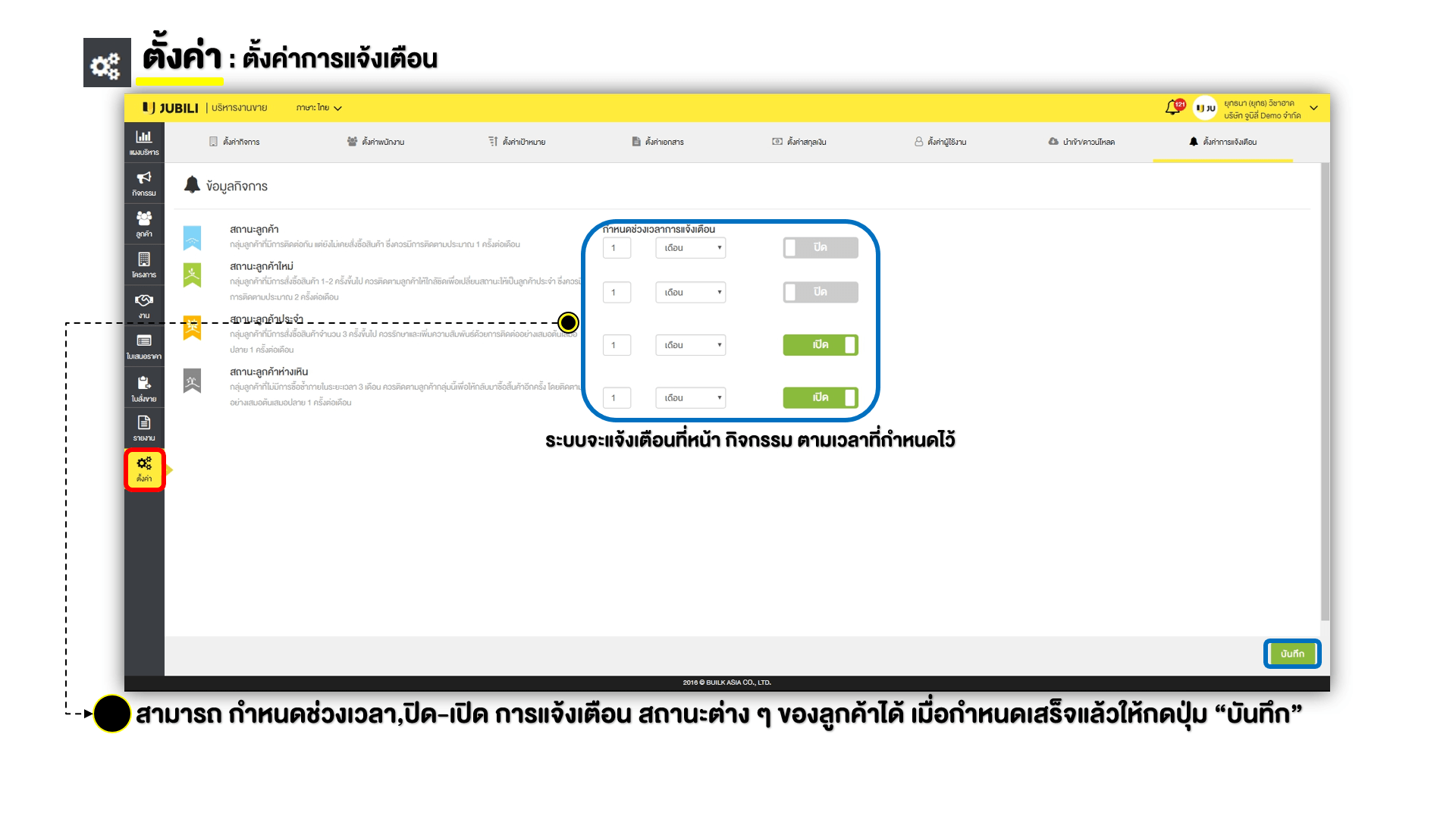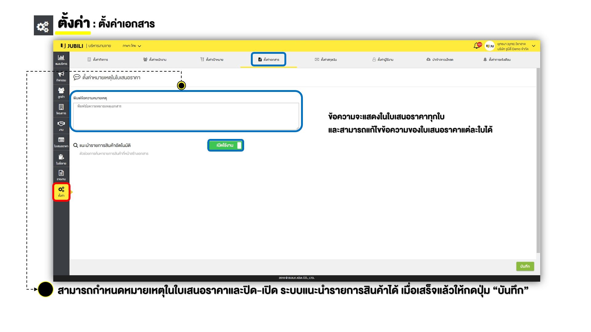 JUBILI by BUILK สามารถทำการตั้งค่าโปรแกรม เพื่อให้เหมาะสมกับความต้องการของบริษัท โดย Admin สามารถทำการตั้งค่าได้ด้วยตนเองได้ ด้วยแถบตั้งค่าทางด้านซ้ายมือ
