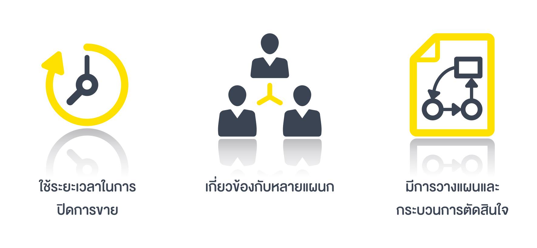 แต่คงเป็นเรื่องยากที่จะขายงานฮาร์ดแวร์ และระบบ ERP, MRP, CRM, HRM สำหรับบริหารองค์กรขนาดใหญ่ ด้วยช่องทางอีคอมเมิร์ซ ที่ให้ผู้ใช้งานอ่านข้อมูล เลือกเปรียบเทียบสเปค และหยิบใส่ตะกร้าจ่ายเงินเอง แบบสินค้าอุปโภคบริโภค B2C ที่เราคุ้นเคย ลูกค้าที่ต้องจ่ายเงินซื้อสินค้า/บริการที่มีความซับซ้อน และมูลค่าสูง ต้องการความมั่นใจจากผู้ขายอย่างมาก ต้องการคำปรึกษาและบริการแบบเฉพาะเจาะจง ต้องอาศัยทั้งการตลาดออนไลน์-ออฟไลน์ การบริหารทีมขาย และการดูแลความสัมพันธ์ลูกค้าประกอบกัน สินค้าและบริการของคุณยิ่งมีความซับซ้อน ราคาแพง-ยิ่งใช้ระยะเวลาในการตัดสินใจนาน ระยะเวลายิ่งนาน-ยิ่งมีความเสี่ยงจากการเปลี่ยนแปลงภายในองค์กรลูกค้า ดังนั้นการดูแลความสัมพันธ์ลูกค้าในสินค้าและบริการที่มีความซับซ้อนสูง-มูลค่าสูงนี้ จึงมีความสำคัญมากๆ